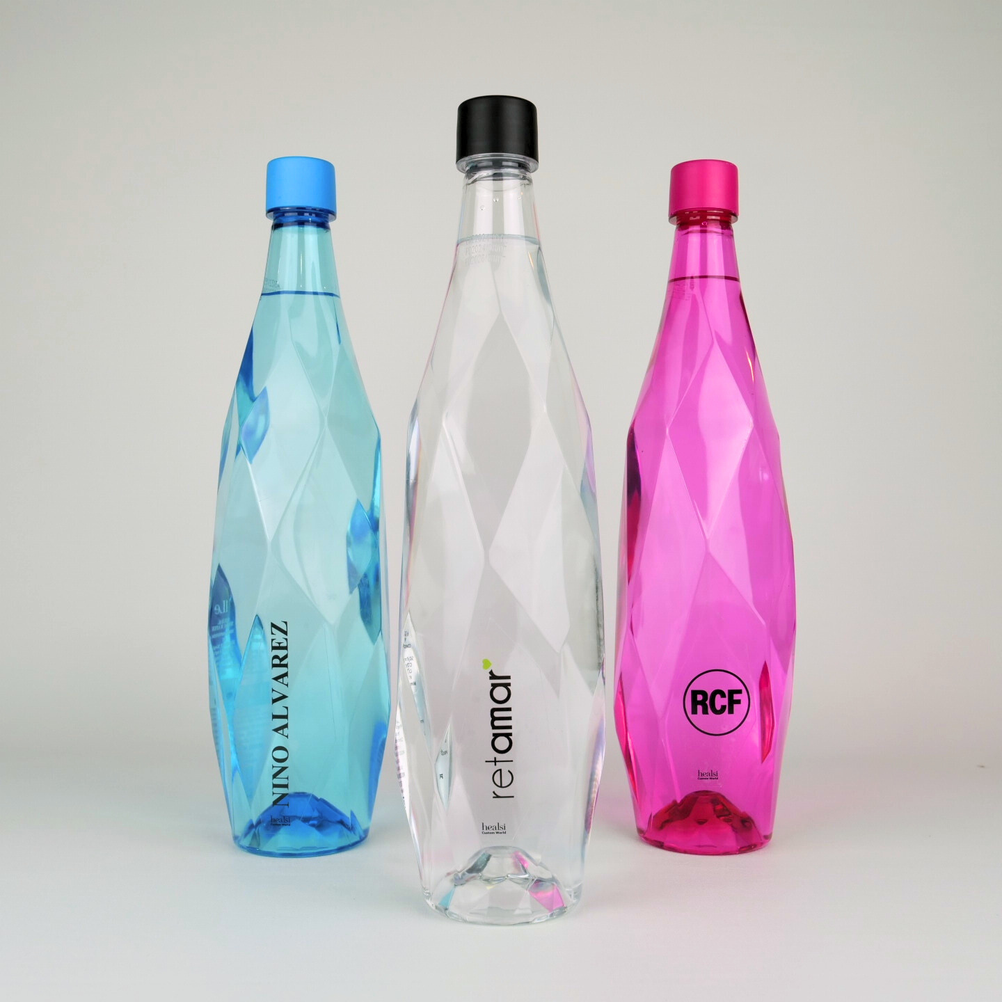 Elegantes botellas de agua personalizada en plástico transparente o de colores sin o con gas. 500ml ó 1l. Con etiqueta o impresión directa. Ideal para eventos